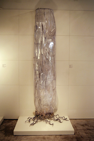 Ixchel Suarez, Futuristic Birch Tree, 2012, Wool, linen, cotton, synthetic fibre, metallic yarns, metal scrap, metal kitchen scrubs, mirrors, photo: Gareth Bate.