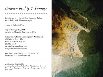 Between Reality& FantasyGareth Bate in exhibition at Katherine Mulherin Contemporary Art Projects, Toronto.Featuring work by Gareth Bate, Courtney Burke, Tia Halliday and Shlomi Greenspan. Curator: Deborah Wang July 23 to August 2, 2009 Open Thursday & Friday 12 -7, Saturday 12 - 6, Sunday 12 -5, or by appointment. Katherine Mulherin Contemporary Art Projects - 30 - |