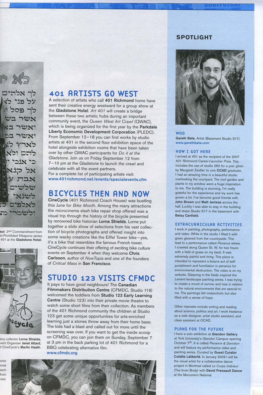I arrived at 401 as the recipient of the 2007 401 Richmond Career-Launcher Prize. This includes the use of studio 260 for a year gien by Margaret Zeidler to one OCAD graduate. I had an amazing time in a beautiful studio overlooking the courtyard. The roof garden and plants in my window were a huge inspiration to me. The building is stunning. I'm really grateful for the experience and my work has grown a lot. I've become good friends with John Brown and Matt Janisse across the hall. Luckly I was able to stay in the building and share Studio S17 in the basement with Betsy Canfield.