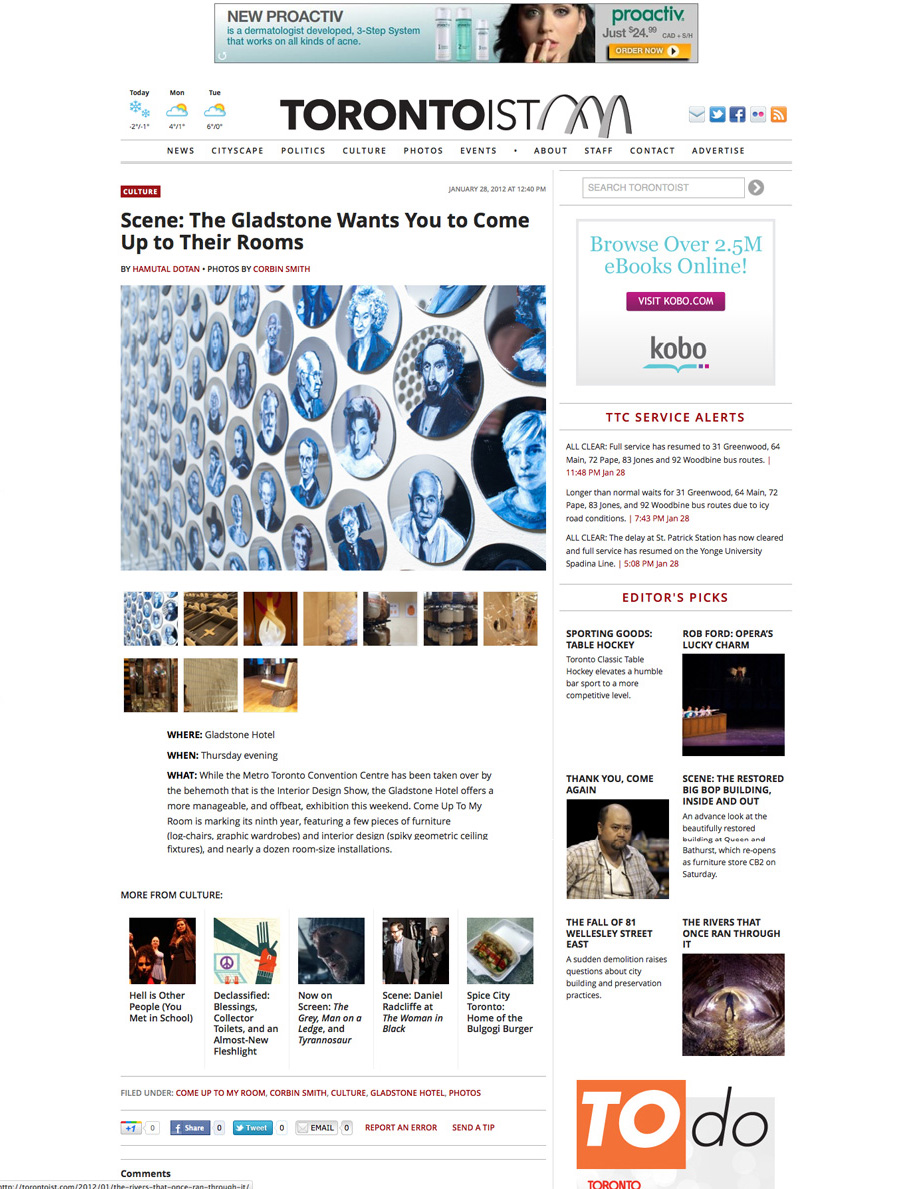 WHAT: While the Metro Toronto Convention Centre has been taken over by the behemoth that is the Interior Design Show, the Gladstone Hotel offers a more manageable, and offbeat, exhibition this weekend. Come Up To My Room is marking its ninth year, featuring a few pieces of furniture (log-chairs, graphic wardrobes) and interior design (spiky geometric ceiling fixtures), and nearly a dozen room-size installations.
