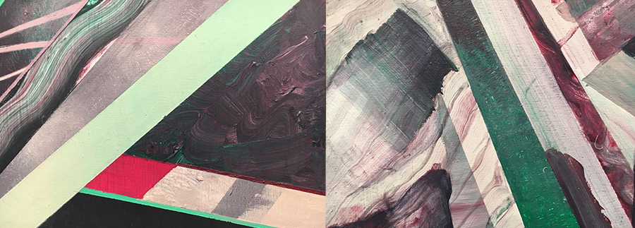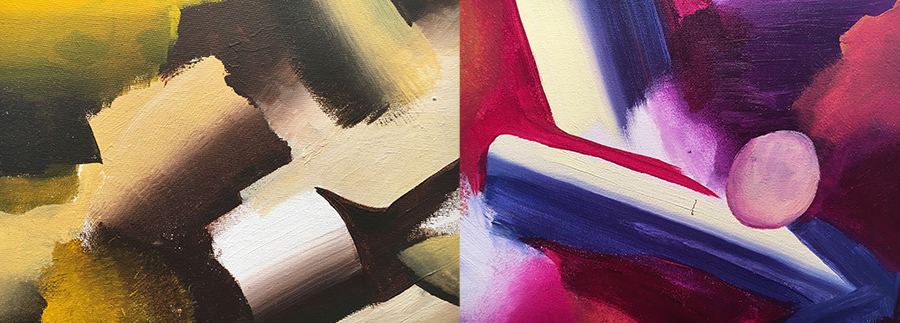 The top two paintings use blending to create different gradients. I used soft brushes including the challenging fan brush. Below I’m working with sharp edges. But how did I keep it so clean and sharp? Paintings by Gareth Bate.