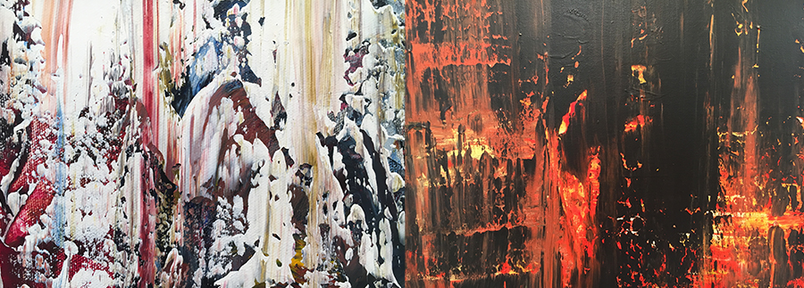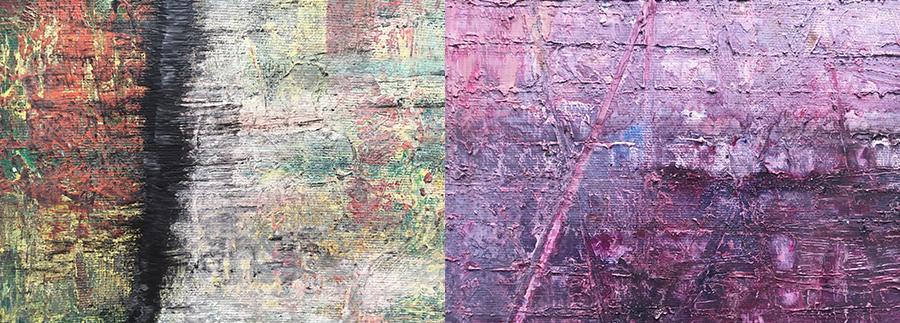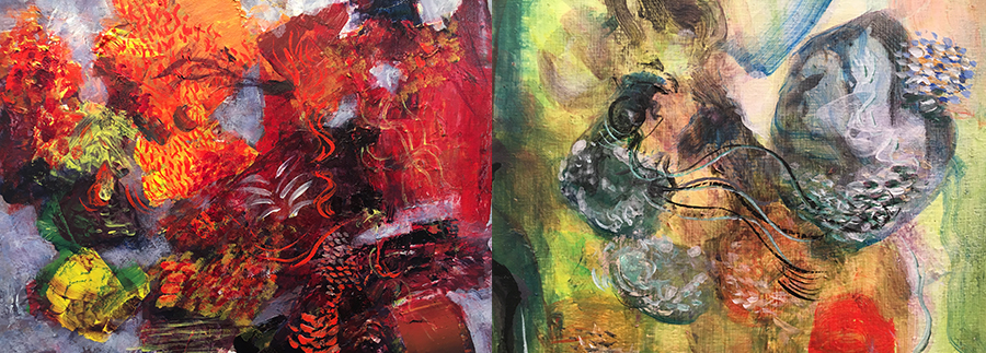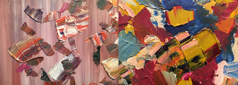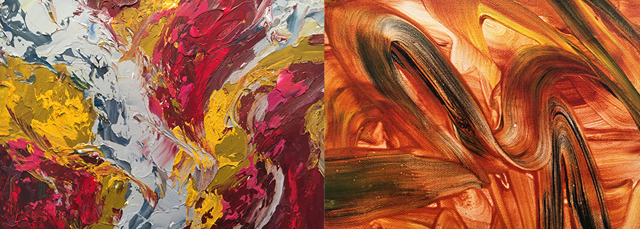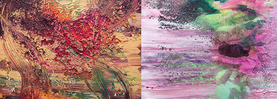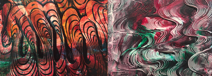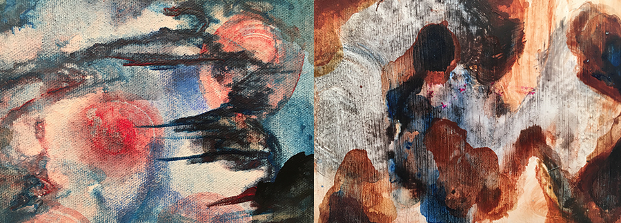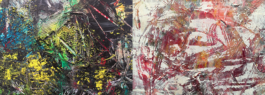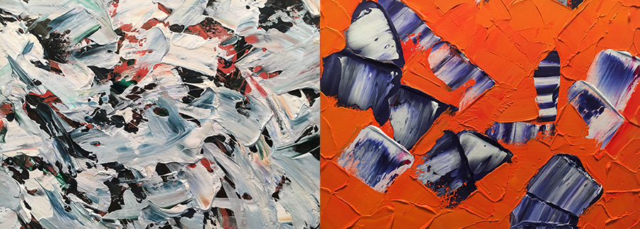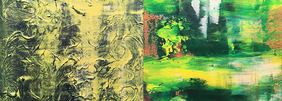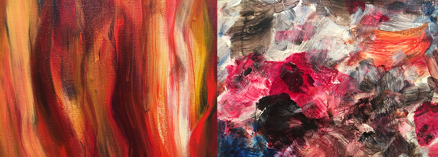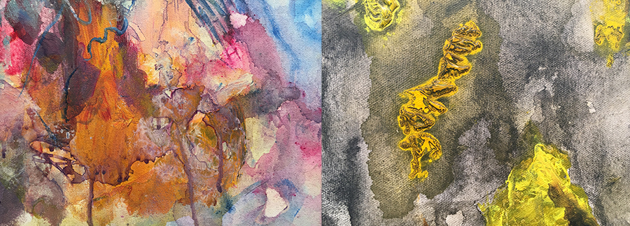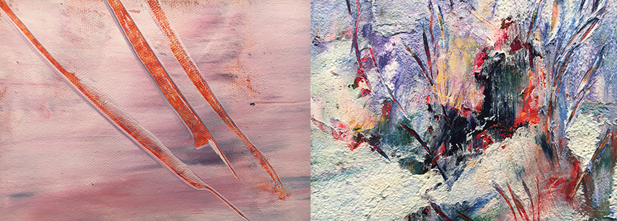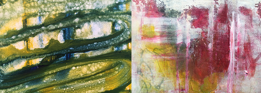 All of the images on this page are painting effects I’ve created for this course. The two at the top use the technique "wet on wet" where the colours are mixed by overlaying strokes on top of each other. The bottom two are examples of sgraffito which means scratching through the paint surface with different tools. Paintings by Gareth Bate.