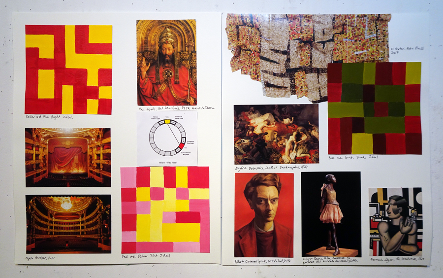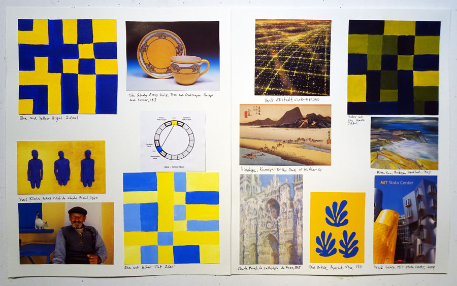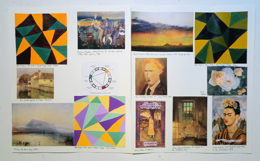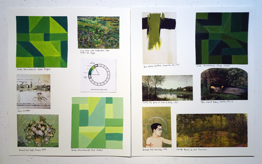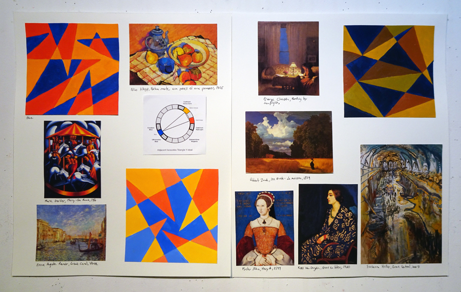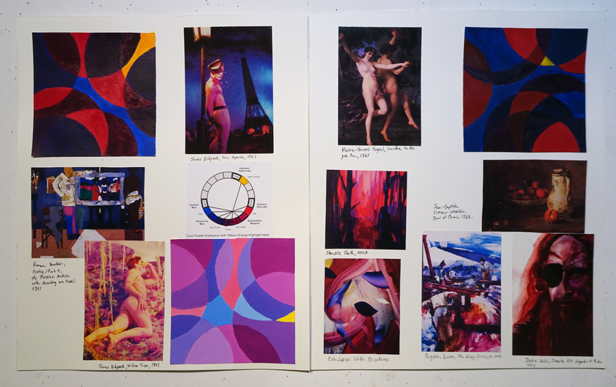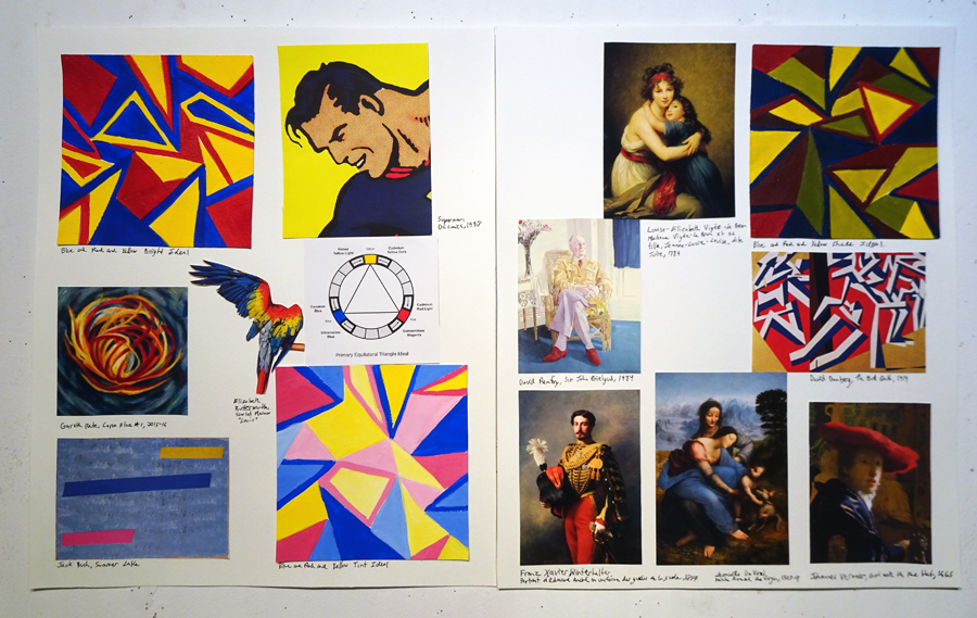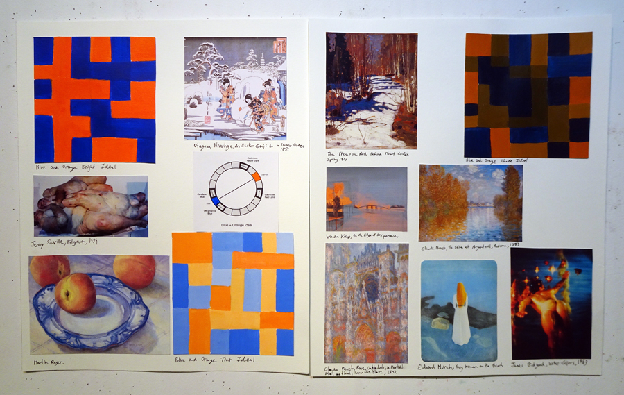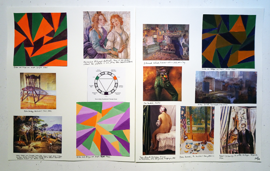 LESSON: At the start of class we walk around and talk about your work. We’ll look at any imagery you found and where it might fit into your book. Next I give a presentation where we’ll discuss the weekly colour relationships. We’ll look at real world examples of how historic and contemporary artists use these schemes in surprising and fascinating ways that are not at all obvious. Sometimes the schemes are very subtle. That’s the key. There’s so much more going on than you might realize. We’ll talk about the vibe and overall effect of these colour schemes. What kind of mood or feeling do they convey?