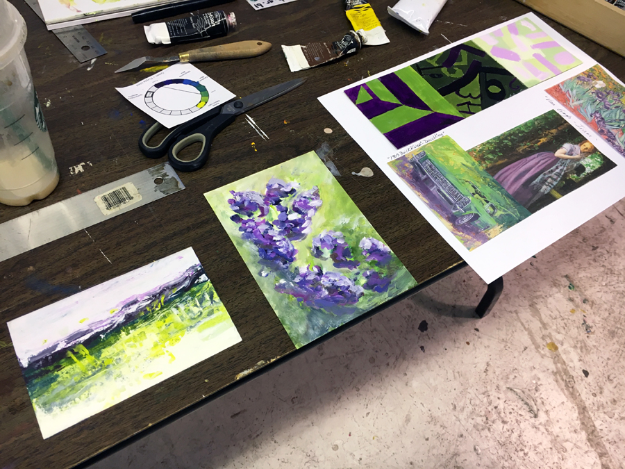 Here David Serber is recreating his landscape painting. Throughout the course he used the same image and changed the colours into a new scheme each week. It was very cool. This one is Purple + Green.