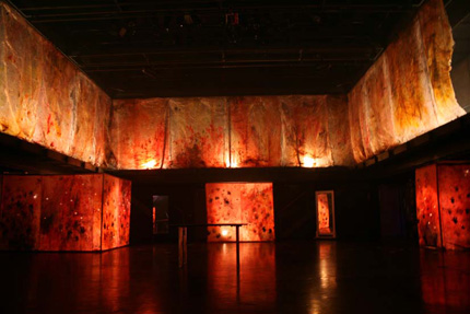 The set design installation for "Corps Intérieur" (Inner Body) pushes the boundaries of painting, as well as set design, with an immersive environment where the audience descends into a glowing underworld reminiscent of a pulsing inner body. The provocative performance by David Pressault Danse in collaboration with Danse-Cité premiered in Jan. 09 at the Monument National Theatre in Montreal. The show was very sucessful and sold out several nights. It was remounted Nov. 30 - Dec 3, 2009.