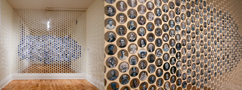 My Jewel Net of Indra is an ongoing painting-based installation that will take at least 5 years to complete. It is a cosmology representing the interconnectedness of humanity. The starting point is a Mahayana Buddhist metaphor of an infinite net of jewels, each representing an individual. Every jewel contains a reflection of all others. The installation attempts to represent the totality of lives lived. It is "everyone." I am interpreting the metaphor as a meditation on the possibilities of life, and our relationships to the individuals who shape history. It is about self-reflection. The installation is an image of an idea of the self. Do we construct our self-image out of the stories of these people? Are we the accumulation of them? Who are they? What lives did they live? What choices did they make? How do they interconnect and influence each other? What aspects of them are within us?